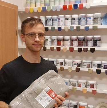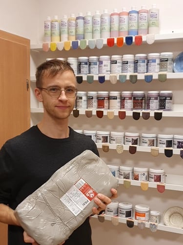 Na miejscu znajdziesz bogaty wybór szkliw i farb podszkliwnych, a także trzy podstawowe rodzaje gliny. Sezonowo pojawiają się u nas także kolorowe gliny i materiały specjalne.